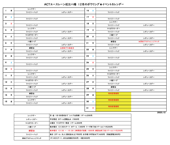 要チェック!12月のボウリングカレンダー